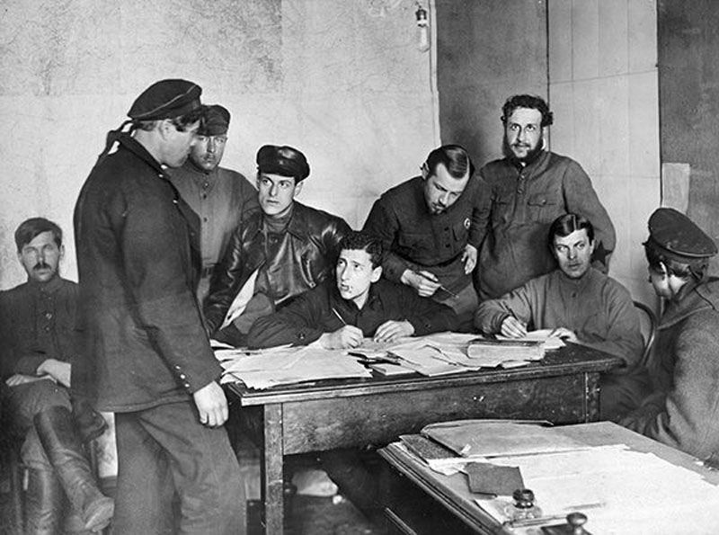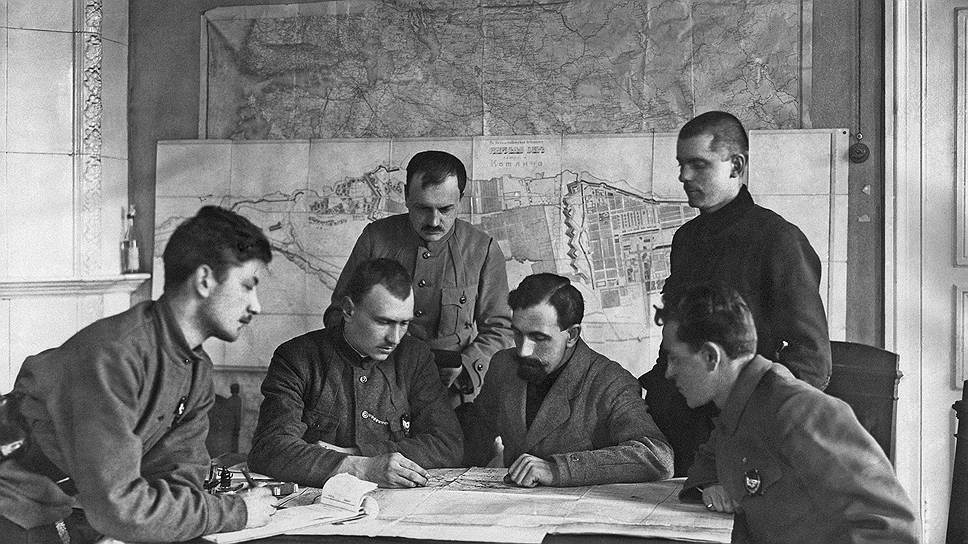 Комдив Дыбенко (третий справа, почему-то в гражданском пиджаке) со своим штабом планирует первый штурм Кронштадта, состоявшийся 8 марта и закончившийся полным провалом.