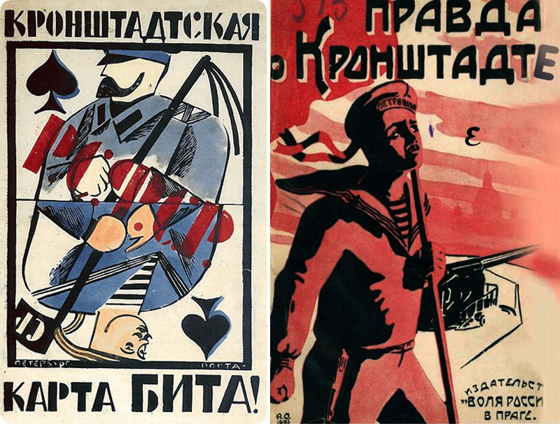 Слева — пропагандистский плакат «Окон РОСТА» с рисунком Владимира Козлинского, посвященный ликвидации восстания, справа — обложка сборника воспоминаний участников Кронштадтского восстания, изданного в Праге в 1929 году.