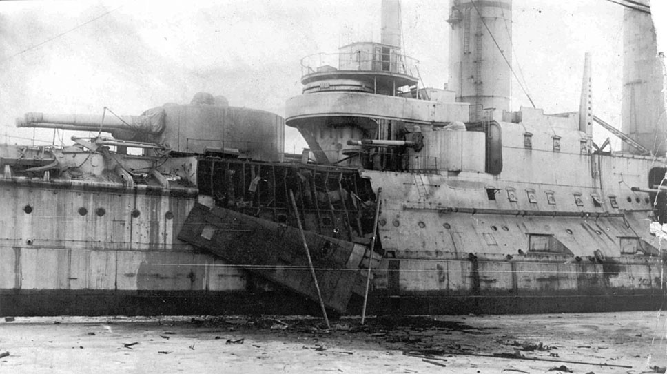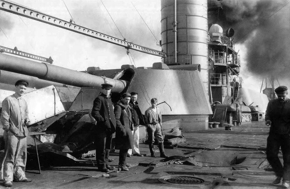 Восставший броненосец «Гражданин» (бывший «Цесаревич») после обстрела с форта «Красная Горка». Интересно, что двумя годами ранее антибольшевицкое восстание вспыхнуло на этом форте, а броненосец участвовал в его подавлении. В отличие от действующих линкоров «Петропавловск» и «Севастополь», которые вели огонь по наступающим большевикам, «Гражданин», превращенный в плавучую казарму, не участвовал в артиллерийских дуэлях. У него не было ни боезапаса, ни подготовленного расчета, ни технической возможности выйти в море или использовать главную артиллерию.