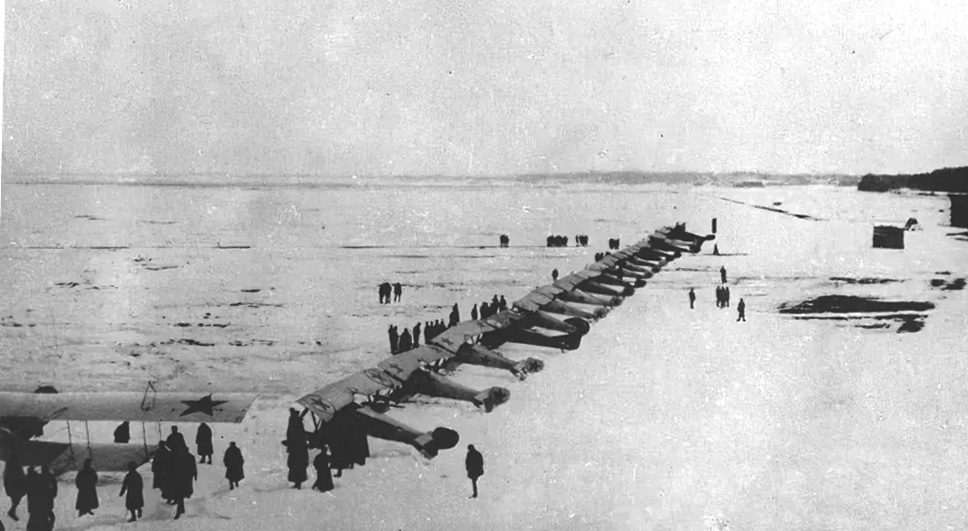 Большевицкая авиагруппа, собранная в Ораниенбауме для бомбардировки Кронштадта. В основном — «Ньюпоры», но слева виден «Фарсаль», в середине строя — «Спад» S.VII, а позади него — невесть как затесавшийся «Виккерс» FB-19 — довольно редкая для России машина.