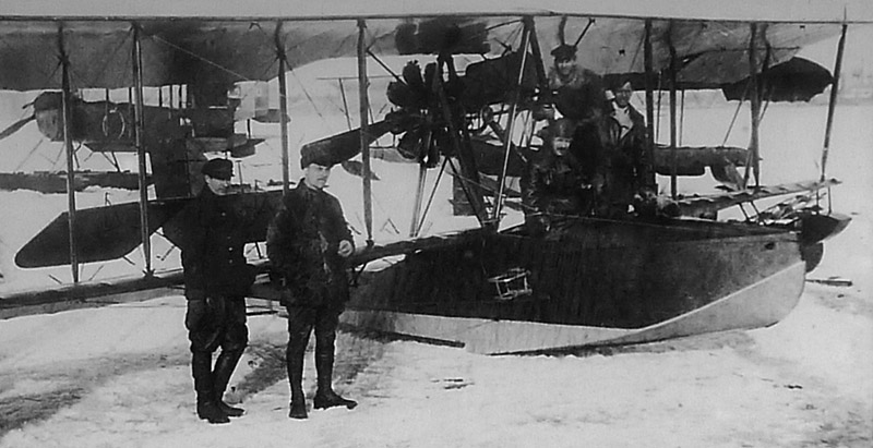 Экипаж летающей лодки М-20, участвовавший в бомбардировках Кронштадта. Слева на заднем плане виден трофейный английский гидросамолет «Фэйри» F-3, с которого была сброшена бомба, поразившая «Петропавловск».