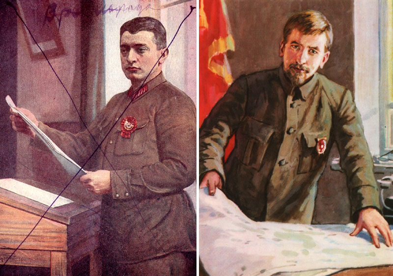 Еще двое победителей Кронштадта, по какому-то странному стечению обстоятельств тоже оказавшиеся «фашистами». Слева — открытка 1932 года «Член Реввоенсовета товарищ Тухачевский». Изображение перечеркнуто, а сверху фиолетовыми чернилами написано «Враг народа». Во время подавления Кронштадтского восстания Тухачевский командовал 7-й армией. Расстрелян 12 июня 1937 года. Справа — еще одна открытка уже хрущевских времен, изображающая А.И. Седякина — командующего Южной группой войск, наступавшей на Кронштадт со стороны Петергофа и Ораниенбаума. Разумеется, он тоже расстрелян, но чуть позже — 29 июля 1938. А при Хрущеве — посмертно реабилитирован.