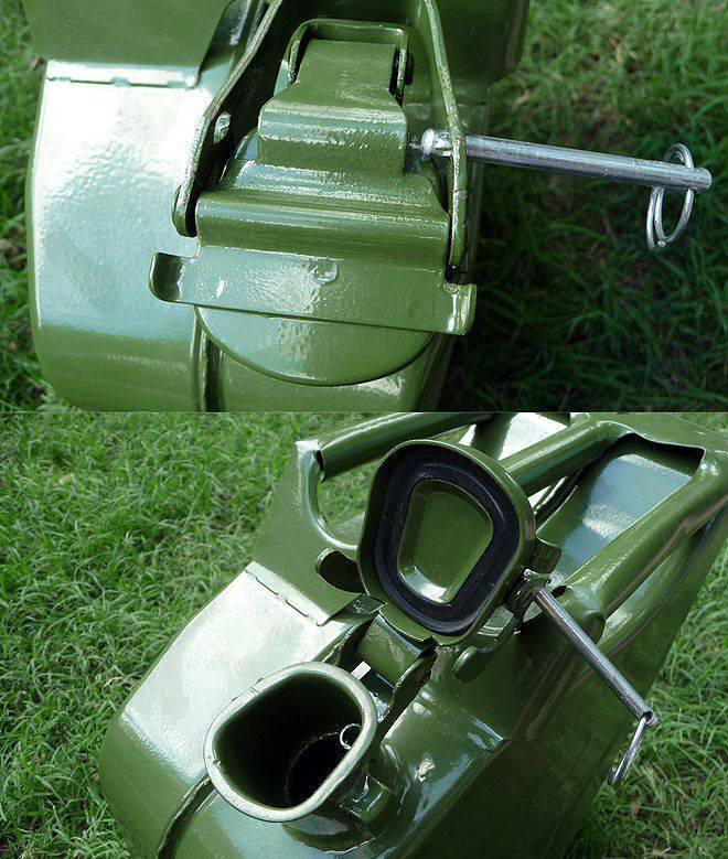 Горловина канистры имела характерную сплюснутую с боков форму. На ее внешней поверхности имелись скобы замка и П-образный кронштейн крышки. Последняя крепилась шарнирно, оснащалась резиновым уплотнителем и фиксировалась при помощи качающегося замка. В конструкции крышки и ее механизмов предусматривались отверстия для установки чеки. Чека в виде металлического стержня с кольцом позволяла блокировать замок крышки во избежание ее произвольного открытия. Внутри горловины выводился один из концов специальной сифонной трубки. Последняя предназначалась для облегчения наполнения и опорожнения канистры.