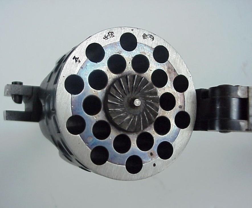 Как вы уже поняли, основной особенностью этого монстра был барабан, вмещавщий 20 патронов .25 калибра (6,35 мм). Также имелись модификации под 6,5 и 7,65 мм патрон. Разумеется, что с увеличением калибра уменьшается и количество зарядов – 7,65 версия имеет барабан с 16-ю каморами.