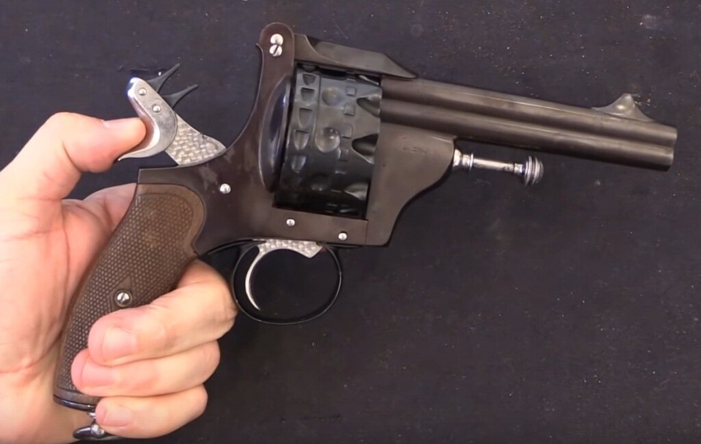 Таким образом, боек ударяет по капсюлю одного патрона из первого или второго ряда, выстрел происходит по очереди из верхнего или нижнего ствола. Ударно-спусковой механизм имел двойное действие, то есть, револьвер мог вести стрельбу как самовзводом так и с предварительно взведенным курком. Экстракция гильз происходит путем «переламывания» рамки вверх и нажатием на специальный шток.