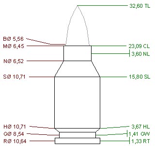 За основу нового боеприпаса была взята пуля калибра 5.56 мм НАТО и гильза патрона 10 mm Auto. Гильза 10 mm Auto была обжата до калибра 5.56 мм, получив бутылочную форму.