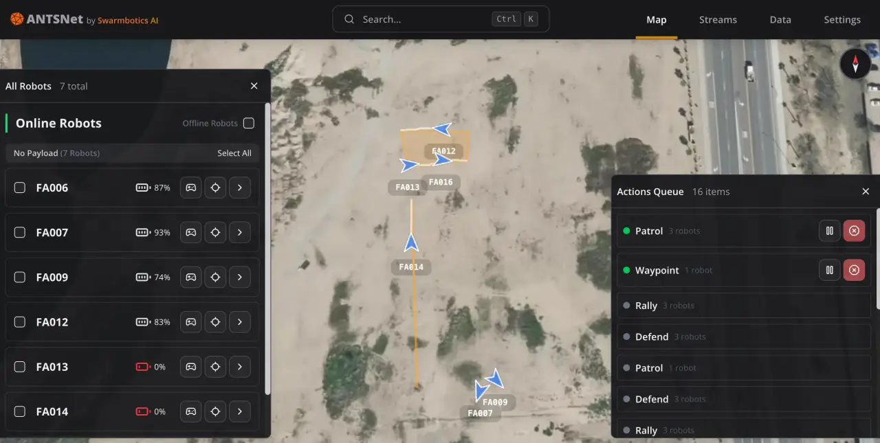 Существующие и перспективные платформы и роботы семейства ANTS должны работать самостоятельно или в составе групп-роёв. Для взаимодействия машин друг с другом и оператором разработана система «управления полем боя» ANTSNet. Она включает необходимые средства связи и программные компоненты, предназначенные для установки на роботах. Кроме того, аналогичные средства используются на операторских станциях.