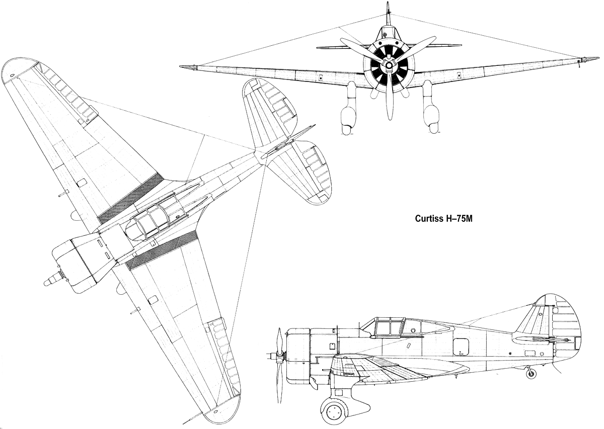 11.Упрощенная и удешевленная экспортная версия Curtiss-75O с неубирающимся шасси, предназначенная для Аргентины. Под крылом видны характерные для этой модификации ракетно-бомбовые подвески, поскольку самолет рассматривался как истребитель-бомбардировщик и легкий штурмовик.