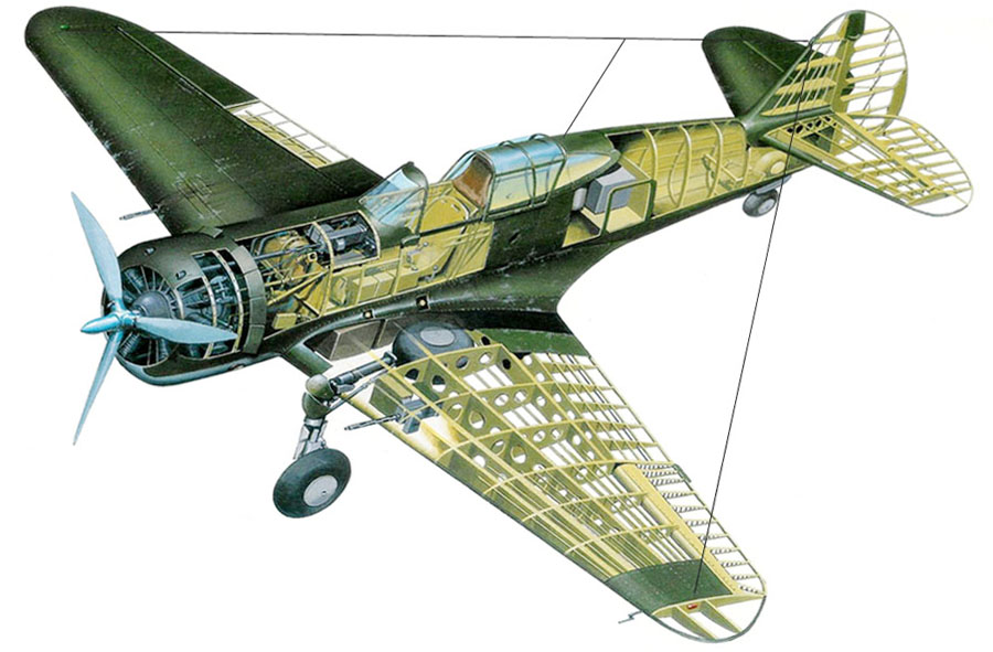 15.Компоновочная схема Р-36. Самолет имел цельнометаллическую конструкцию с фюзеляжем типа полумонокок и гладкой обшивкой, приклепанной к каркасу заклепками с потайными головками. Стандартное вооружение составляли четыре пулемета винтовочного калибра: два — над двигателем и два — в крыле, хотя встречались и другие варианты.