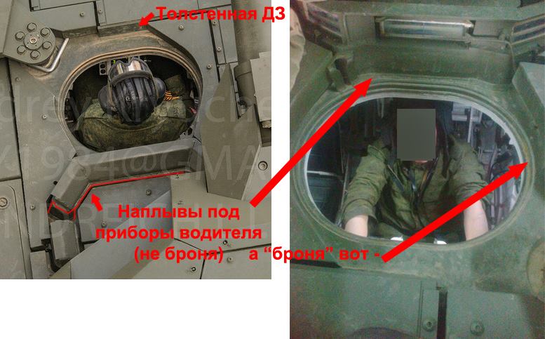Толщину бортовой брони можно определить по фотографиям люка мехвода, где толщина брони между шарниром люка и краем корпуса составляет около 60 мм, что даже меньше чем у танка Т-72(70 мм). При чем и эти 70 мм пробивается очередью автоматической пушки БМП PUMA с расстояния примерно 1000-1500 метров, а при размещении боекомплекта в корпусе танка, так же как и на старых советских танках, превращает «Армату» в настоящий башнемет.