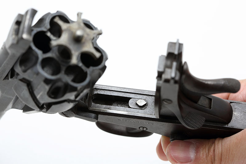Нижняя часть рамки состоит из направляющих для верхней части, спусковой скобы и рукоятки оружия. Курок расположен на верхней подвижной части рамки. Ударно-спусковой механизм двойного действия; первый выстрел из револьвера можно производить как самовзводом, так и взведя курок вручную. При последующих выстрелах откат верхней части рамки вызывает автоматическое взведение курка и поворот барабана.