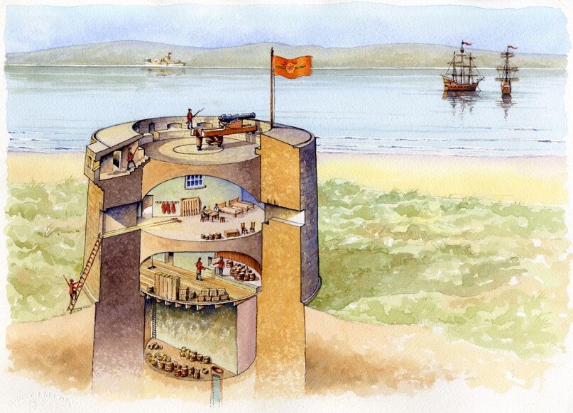 Первая половина XIX века — время самого-самого начала какой-то военной стандартизации. Только в Наполеоновскую эпоху, говоря упрощенно, произведённое в одном городе колесо начнёт подходить к обозной телеге из другого. Так что весьма необычно в этом периоде встретить, я бы сказал, стандартный проект оборонительного сооружения, применяемый во всех уголках империи. Той самой, над которой никогда не заходит солнце. Итак, давайте вспомним о британских башнях Мартелло.