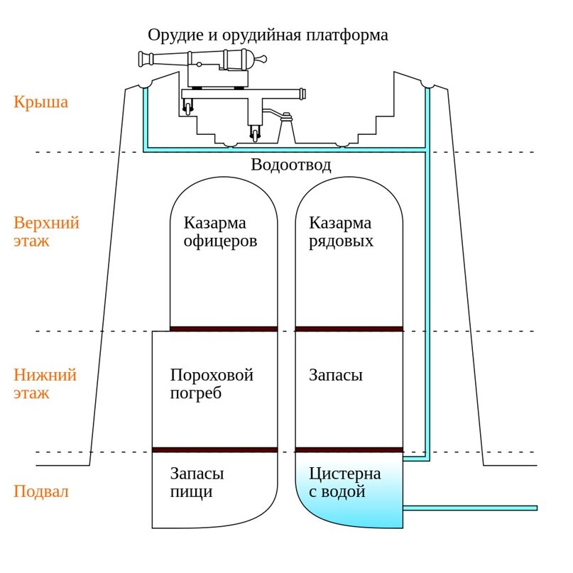 В подвале башня имела или большой резервуар с водой, или даже полноценный колодец, как на рисунке выше. Припасов вообще держали много: как в подполе, так и на первом этаже. Второй же являлся жилым.