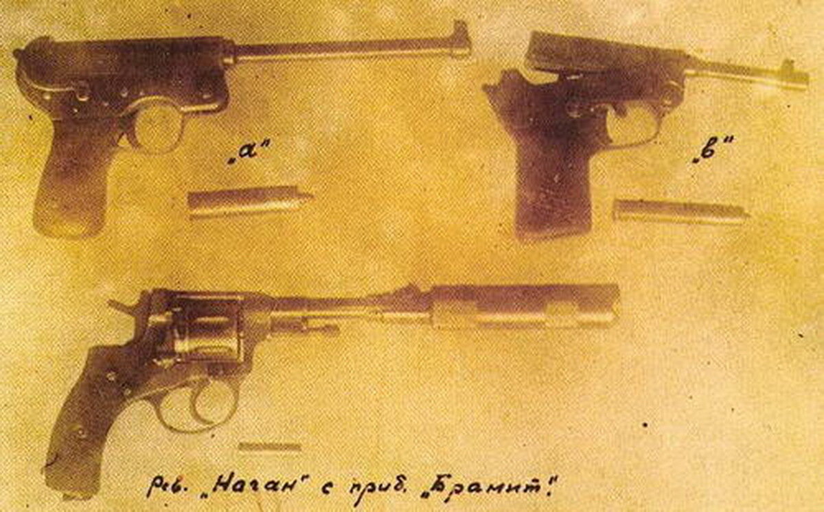 Ещё в 20-х годах прошлого столетия советские изобретатели братья Митины попытались не дать пороховым газам покинуть ствол оружия. Беззвучный револьвер системы Нагана предполагалось оснастить специальным надульным устройством барабанного типа. Патроны для бесшумной стрельбы имели в конструкции специальный поддон увеличенного диаметра, который после вылета пули из ствола запирал пороховые газы внутри оружия. При последующем взводе курка револьвера манипуляции повторялись, а дополнительный дульный барабан вращался, как и боевой. Таким образом, револьвер конструкции В.Г. и И.Г. Митиных мог сделать семь бесшумных выстрелов, после чего требовалась не только перезарядка оружия, но и очистка глушителя от использованных поддонов.