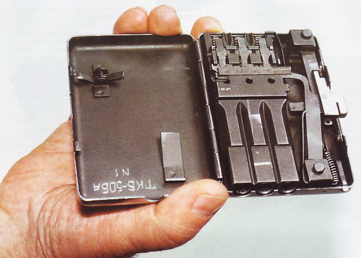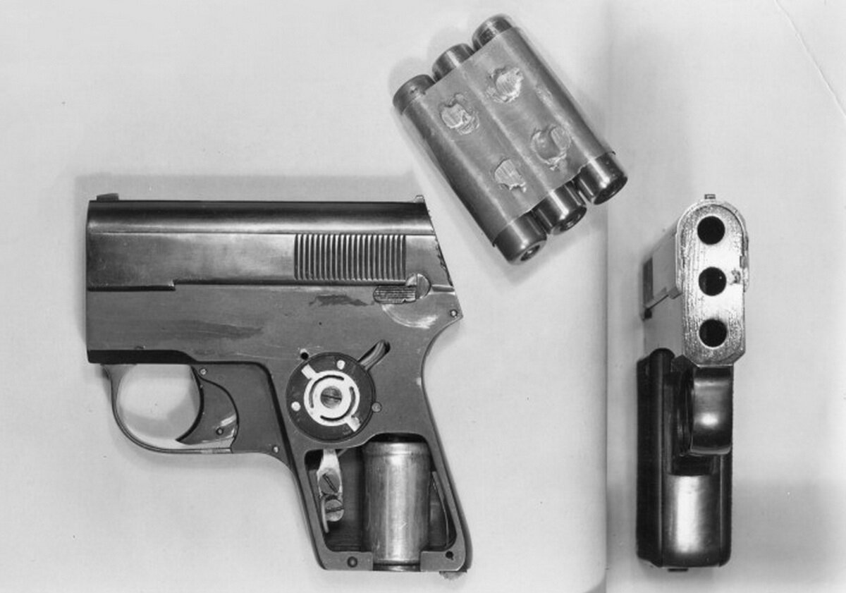 Для стрельбы смертоносными патронами в лаборатории МГБ создали ряд многоствольных стреляющих устройств, замаскированных под различные бытовые предметы. Были среди них и классические специзделия в виде двух- и трёхствольных пистолетов. Изначально они имели привычный ударный спусковой механизм, звук применения которого отчётливо слышался в тишине. В дальнейшем и от этого демаскирующего фактора удалось избавиться, применив электромеханический способ воспламенения порохового заряда. Однако предательство майора Н.Е. Хохлова, в 1954 году передавшего сведения и образцы такого оружия американской разведке, заставили в очередной раз начать поиски новых технических решений стрельбы без шума и дыма.