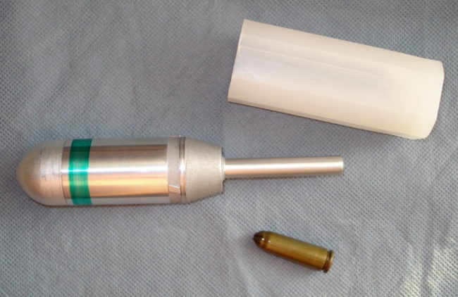 Для метания гранаты используются специальные холостые патроны ПХС-19, снаряжаемые в магазин вместимостью 8 патронов, вставляемый в рукоятку оружия. Патроны досылаются из магазина в казенную часть ствола и запираются там при помощи продольно скользящего поворотного затвора, приводимого в действие рукой стрелка. Казенная часть ствола и дульная разделены специальным поршнем-толкателем, воспринимающим на себя импульс пороховых газов патрона при выстреле и энергично выталкивающим гранату из ствола. После выстрела поршень упирается в специальное сужение в стволе, запирая внутри ствола горячие пороховые газы. Тем самым исключается или заметно снижаются демаскирующие стрелка факторы – дульная вспышка и громкий хлопок выстрела. После выстрела пороховые газы остывают и стравливаются из ствола. Начальная скорость гранаты составляет 105 м/с, при попадании в цель ее боевая часть способна пробить до 10мм стали и воспламенить находящееся за ней топливо или иные легкогорючие материалы.