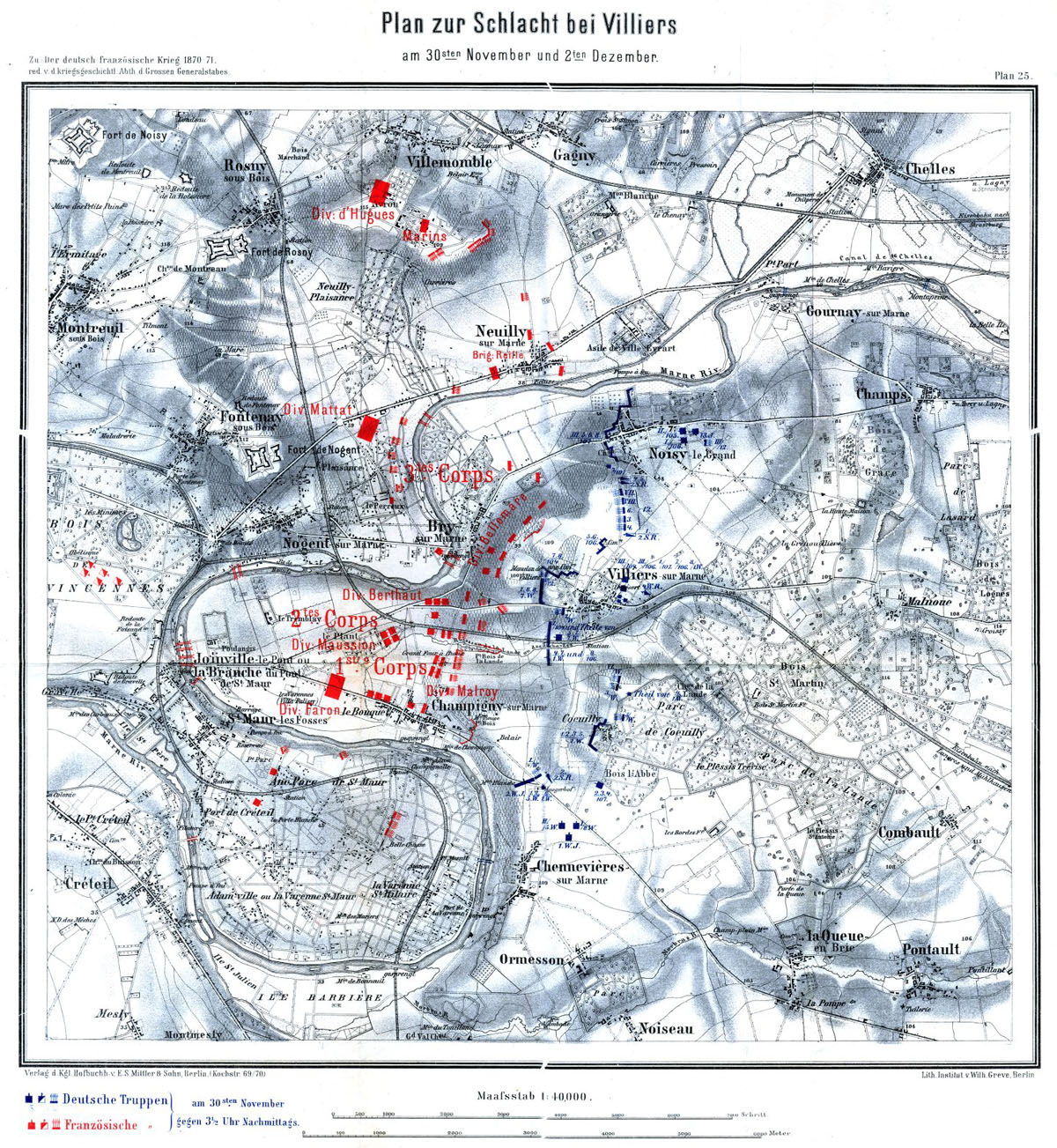 Утром 2 декабря они нанесли контрудар и начали теснить противника к переправам. К середине дня французам пришлось оставить Бри. Скорострельные крупповские пушки, как это уже не раз бывало, подавили огонь французских батарей, а без артиллерийской поддержки «пуалю» с большим трудом удерживали недостроенные полевые укрепления и развалины домов.