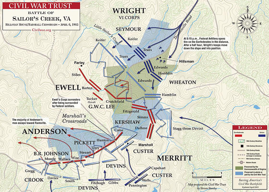 6 апреля 1865 года произошла битва у ручья Литтл Сэйлорс Крик — предпоследнее сражение американской гражданской войны. К тому моменту ее исход уже не вызывал сомнений. За четыре года боев конфедераты понесли невосполнимые потери, их территория была разрезана пополам глубоким рейдом генерала Шермана, экономика находилась в полном упадке, а за три дня до битвы северяне захватили их столицу — город Ричмонд. В армии Юга под командованием генерала Ли оставалось около 40 тысяч усталых солдат (внешним видом напоминавших скорее оборванцев) без артиллерии, продовольствия и почти без боеприпасов.