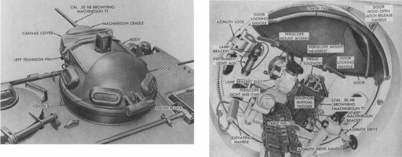 Опытные образцы линейки T59 оснащались сравнительно простым командирским люком, на котором имелась пулеметная установка для крупнокалиберного пулемета M2HB. Такими же устройствами комплектовались и серийные бронетранспортеры первых партий. В дальнейшем было принято решение о переделке комплекса вооружений. Над рабочим местом командира теперь следовало устанавливать командирскую башенку типа M13. Такое устройство могло вращаться вокруг вертикальной оси и оснащалось набором смотровых приборов. Задняя часть купола башни выполняла функции откидной крышки. В крупном лобовом агрегате находилась качающаяся установка для пулемета. Наводить оружие предлагалось при помощи перископического прицела. С определенного времени такие башенки стали устанавливать на серийную технику; уже построенные машины получали подобное оснащение в ходе ремонта. Во всех случаях боекомплект состоял из 2200 патронов в нескольких лентах, перевозимых внутри отделения управления.