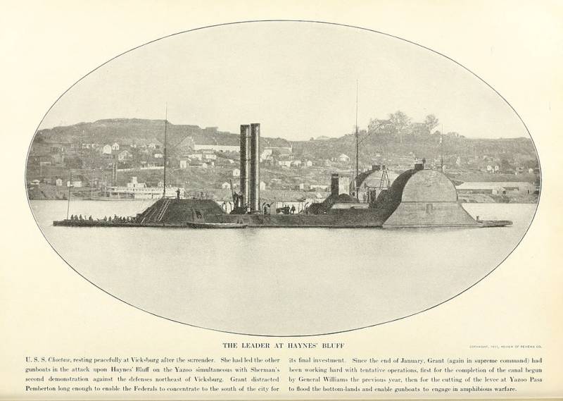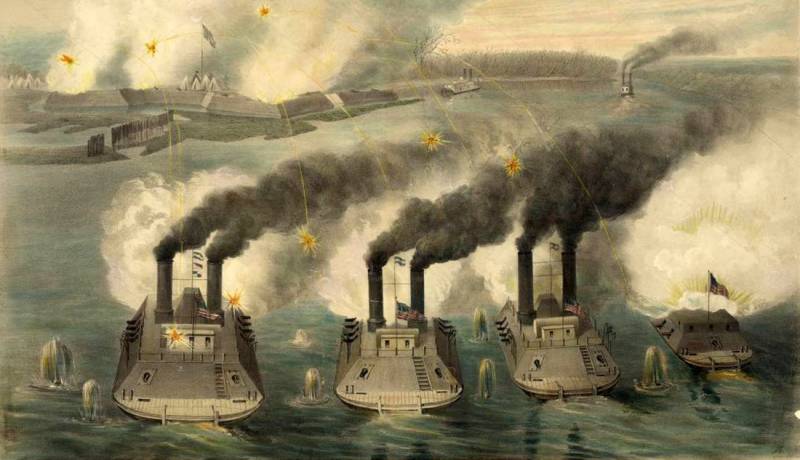 Когда весной 1863 года северяне начали блокаду Виксбурга, корабли генерала Гранта уже господствовали на всем протяжении течения Миссисипи. Оставался лишь Виксбург, и вот в ночь на 22 апреля его корабли пошли на прорыв мимо фортов конфедератов. Последние открыли огонь, но так как все пушки у них были только гладкоствольными, повреждений броненосцам они нанести не смогли.