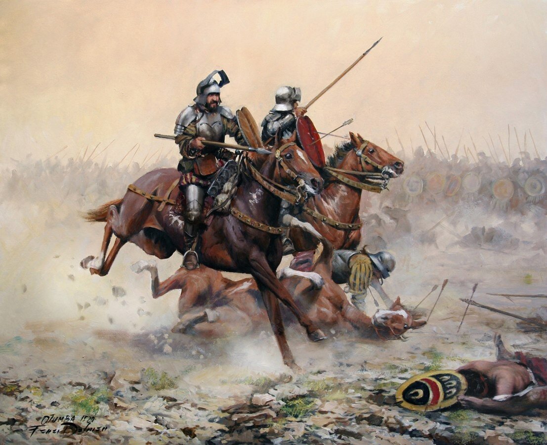 Широко известна «тема с лошадьми». Да, действительно, индейцы их ранее никогда не видели. Это было грозное оружие, опять же, учитывая специфику противника — останавливать конницу индейцам было совершенно нечем, а к этому еще добавлялся мощный психологический фактор. Берем опять Битву при Отумбе. Там Кортес и еще аж двадцать два (!) всадника попросту разметали ацтеков несколькими кавалерийскими наскоками. При правильном применении на открытой местности кавалеристы не оставляли индейцам шансов.