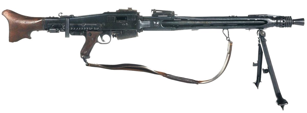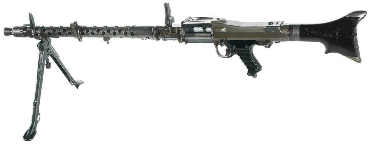 (2) Он имеет превосходное устройство смены ствола, которая производится намного быстрее, чем у MG 34. Простое движение позволяет вынуть из пулемета горячий ствол и обратным движением вставить свежий, холодный ствол.