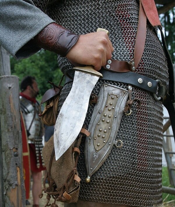 Кинжал пугио был позаимствован практичными римлянами у испанцев где-то между 3 и 2 веками до н.э., имел длину от 15 до 35 см, широкий двулезвийный листовидный клинок с острием и ребром посередине и рукоять с навершием округлой формы и характерным утолщением на черене.