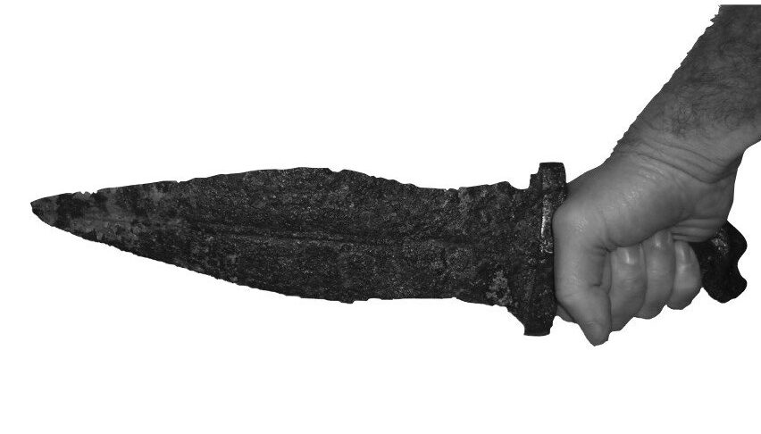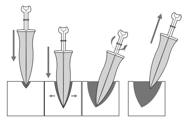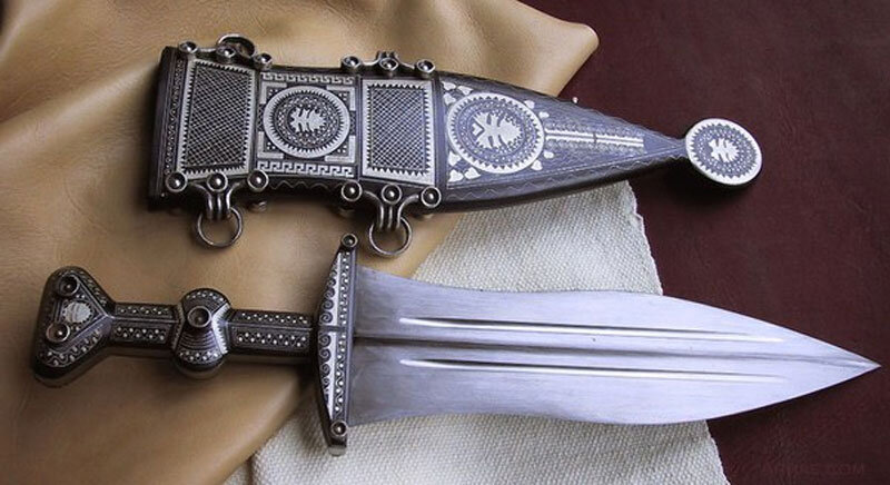 При этом, как считают специалисты, листовидная форма клинка кинжала помогала наносить вполне эффективные уколы, при выполнении которых оружие могло держаться как прямым, так и обратным хватом.