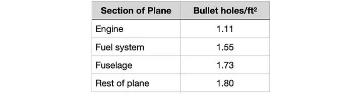 Вальду предоставили данные о расположении отверстий от пуль и осколков на самолётах, вернувшихся из боя. Они показали, что повреждения не распределены равномерно. Вот дистилляция данных Вальда, рассчитанную на основе таблиц подсчёта попаданий и оценок площадей в его отчете SRG: