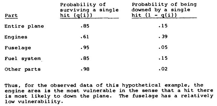Отчеты SRG Вальда очень сухие и технические. На самом деле, он никогда прямо не упоминает о «систематической ошибке выжившего». Получив данные о местах попаданий по выжившим самолётам вместе с несколькими общими заявлениями о потерянных, он изобретательно выводит вероятную модель повреждений пропавших самолётов. Например, он пытается установить границы вероятности того, что самолёт сможет выжить после определённого количества попаданий: