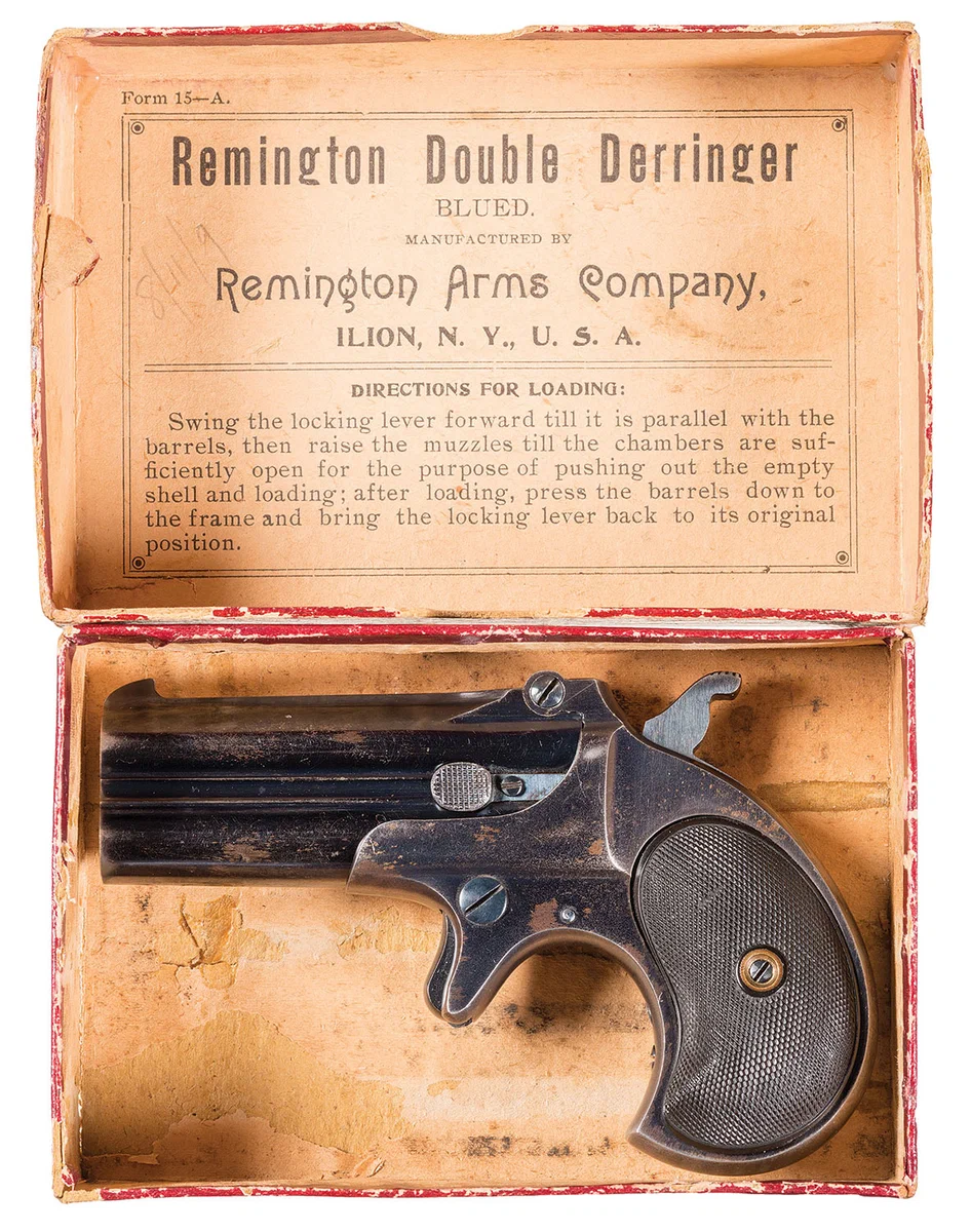 …то переломный дерринджер с двумя вертикальными стволами и автоматическим переключением между ними с помощью храповика, запатентованный Уильямом Эллиотом в 1865 году, стал крайне популярным: «Ремингтон» выпускал «модель 95», она же «Double Derringer», с 1866 года аж по 1935-й, всего было собрано более 150 тысяч штук.
