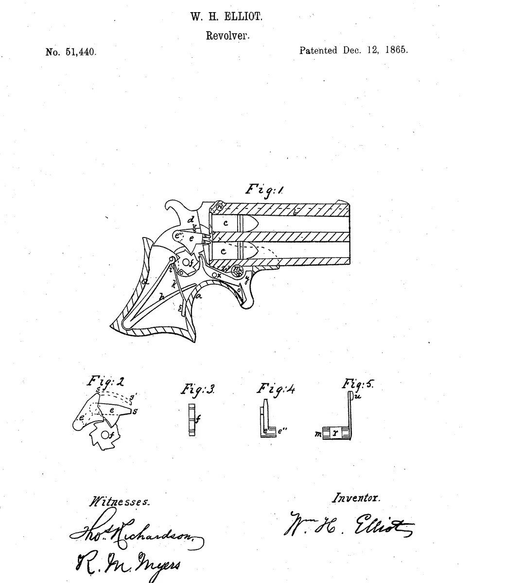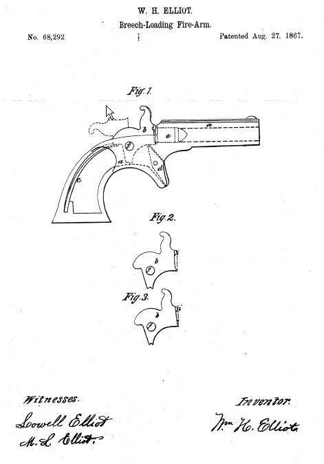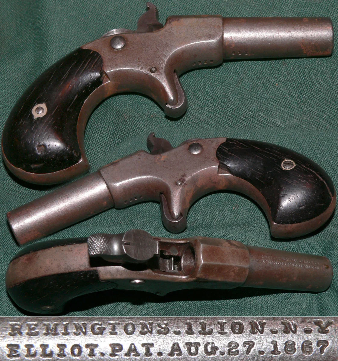 Конкуренты из «Ремингтона» в ответ используют другие схемы авторства Уильяма Эллиота — и, если одноствольный дерринджер с неподвижным стволом и курком, служившим одновременно затвором, прожил недолго, что неудивительно…