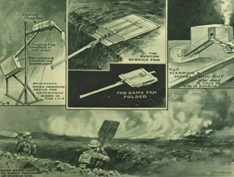После первого применения немцами отравляющих газов на фронтах войны британские исследователи начали активную работу по поиску способов противодействия этому ужасному оружию. Одним из таких способов и был вышеназванный веер. Придумала его английская ученая Герта Айртон. На счету которой уже было довольно много различных интересных и полезных идей.