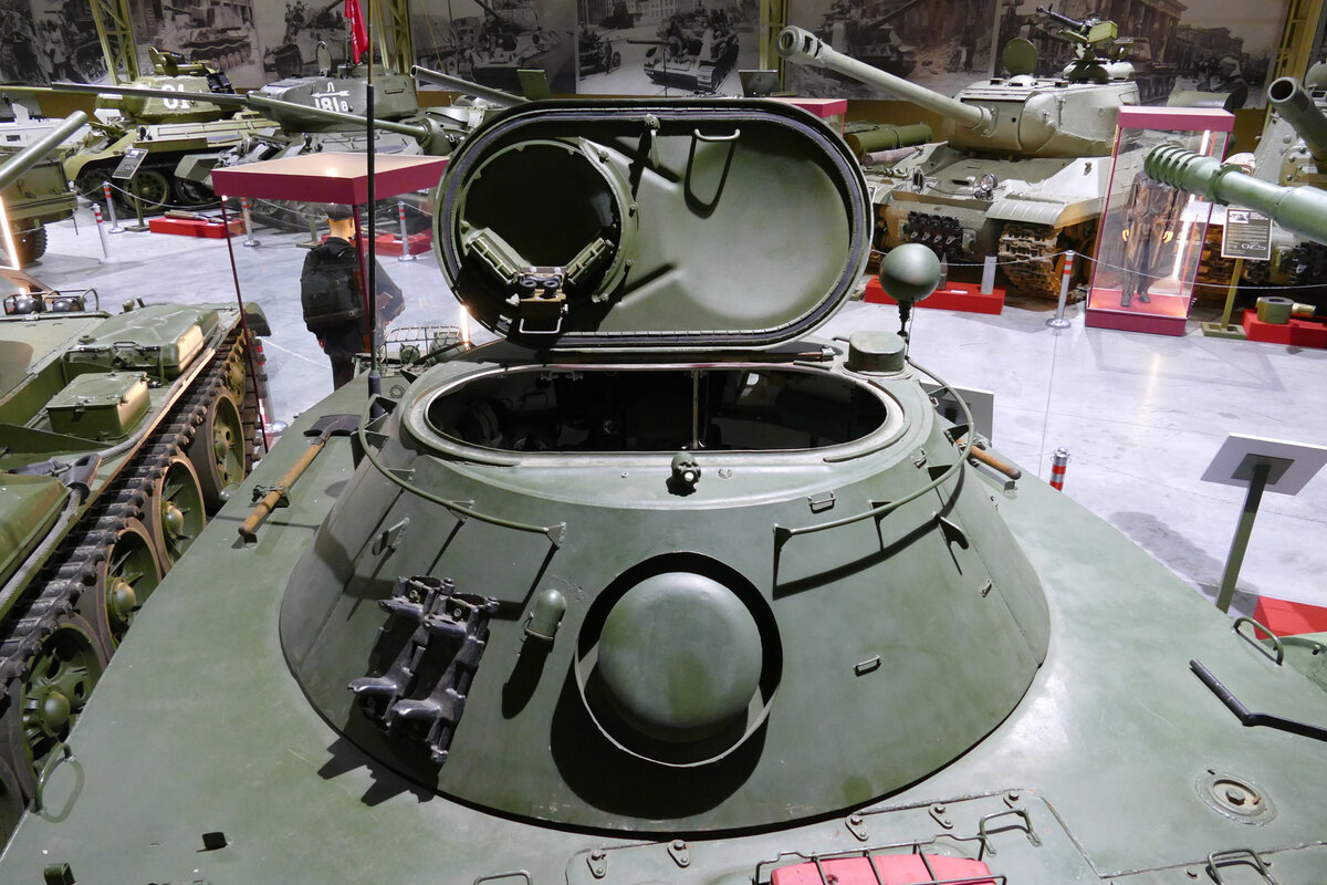 И всё же однолюкая двухместная башня нашла применение в советском танкостроении, причем уже после войны. Такую башню получил легкий танк ПТ-76. Правда, там ни о каком стрелковом щите речи не шло. Единый люк диктовала специфика применения плавающего танка — экипаж, во время форсирования водных преград, был одет в спасательные жилеты, в которых протиснутся через относительно небольшой одиночный люк было довольно проблематично. К тому же ПТ-76 был лишен недостатков предшественников. Например, в створку люка интегрирована смотровая башенка кругового вращения. Да и открывается такой люк проще, потому как весит меньше.