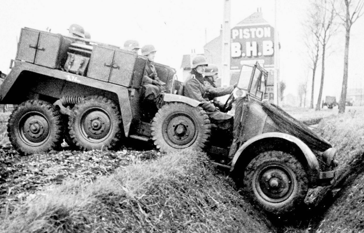 Подобные схемы вертикального размещения вращающихся запасных колёс по обеим сторонам особую популярность получила во Вторую мировую. Зачастую обычным грузовикам приходилось подвозить на передовую и увозить всё необходимое. И поэтому их оснащали такими вот свободно вращающимися колёсами.