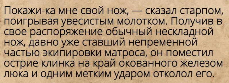 А теперь представьте какой коллектив собирался на корабле после всего этого, да еще и в открытом море, драки тут были частым явлением. Поэтому команду вооружали только в качестве исключения, но без рабочего ножа на флоте тоже было нельзя. В связи с чем у клинков часто откалывали острие.