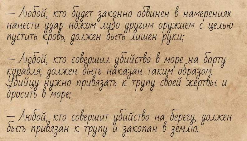 На корабле самое главное это порядок, а порядок это жесточайшая дисциплина, которая требует жестких и четких флотских законов. Может у каждого флота и были свои законы, но в основу их лег один и тот же свод правил «кодекс Олерона». На сколько он был жестким судите сами. Вот несколько правил о которых гласил кодекс: