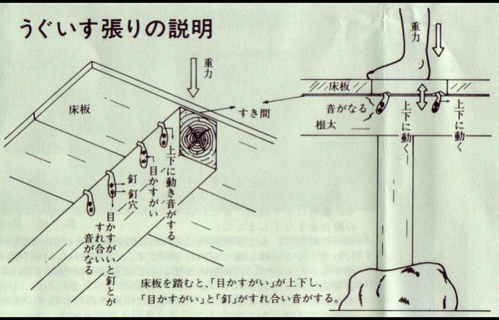 Японская архитектура эпохи феодализма поражает не только своей изысканностью, но и уникальными и необычными средствами защиты. Одним из самых интересных и малоизвестных элементов обороны в японских замках и дворцах были так называемые «соловьиные полы» — uguisubari (鴬張り). Эти полы, при хождении по ним, издавали характерный скрип, напоминающий щебетание птицы. Но для чего они были нужны?
