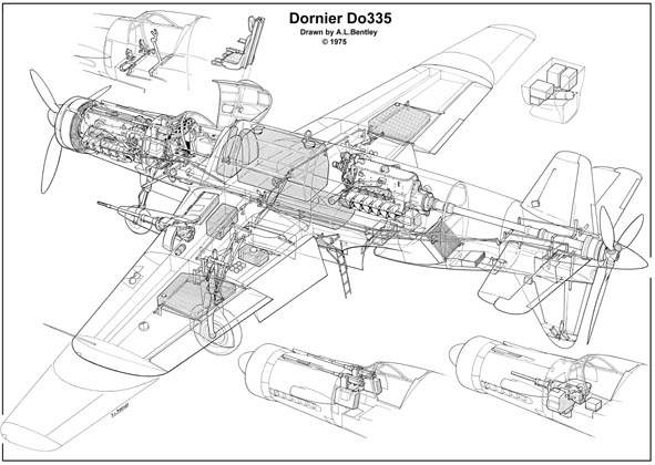 Самолет Do-335 «Pfeil» был многопрофильной машиной, ее планировалось использовать в роли тяжелого дневного истребителя, скоростного бомбардировщика (с бомбовой нагрузкой 500-1000 кг), ночного истребителя (одноместного и двухместного), самолета-разведчика и тренировочной машины. Do.335 представлял собой уже 3-ю вариацию на тему использования 2-х двигателей на линии симметрии самолета – задний двигатель приводил в действие хвостовой винт, расположенный за крестообразным оперением. Такая необычная позиция винта не являлась новинкой, она использовалась еще в 1911 году Татин-Польханом в «Аэро-Торпилле». Но стоит отметить тот факт, что до появления Do-335 никто еще не применял такое расположение заднего винта вместе с использованием обыкновенного тянущего винта спереди, что собственно и обеспечило «Стреле» ее уникальность среди всех остальных боевых машин.