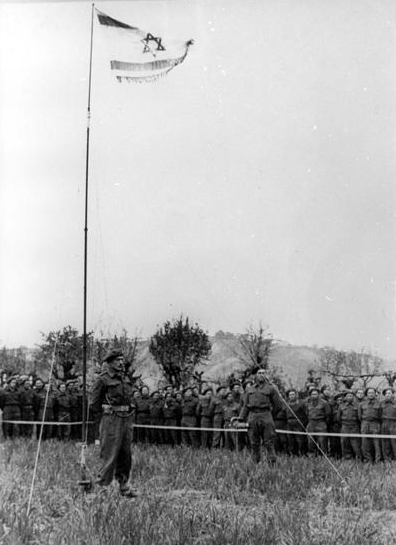 После окончания войны Еврейская бригада разместилась в городе Тарвизио на границе Австрии, Югославии и Италии. Начальник политического отдела Еврейского агентства Моше Шарет провёл переговоры с британским командованием о праве бригады поднять в городе свой собственный флаг вместо флага Великобритании. Переговоры окончились успешно, и в Тарвизио евреи въехали под бело-голубым полотнищем с шестиконечной звездой.