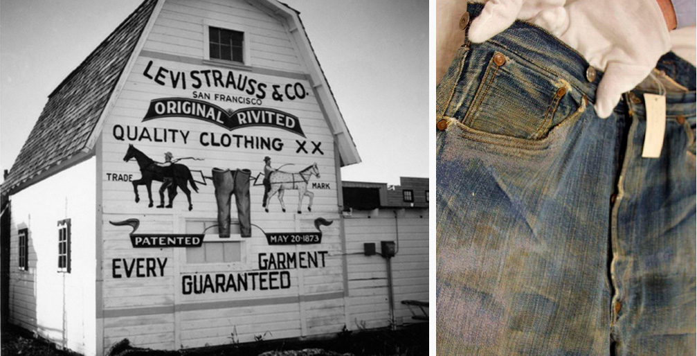 На левой части иллюстрации изображена реконструкция одного из первых магазинов Стросса-Дэвиса в Калифорнии с рекламой джинсов на стене. Справа показаны самые старые сохранившиеся до наших дней джинсы, выпущенные в 1879 году и недавно обнаруженные в одной из заброшенных золотых шахт Калифорнии. Как видно, их можно носить и по сей день.