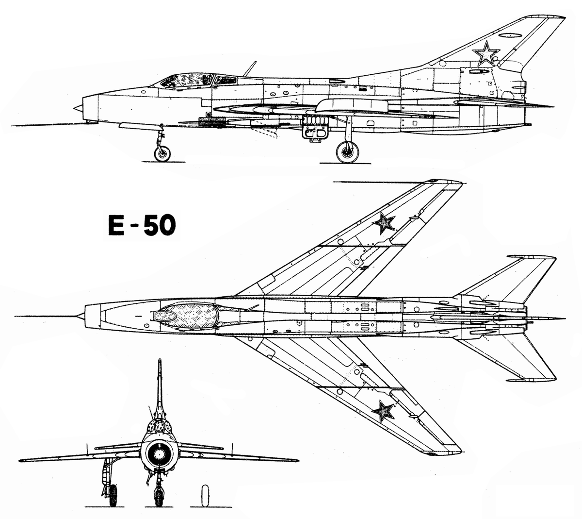 Это предложение поддержало руководство МАП и ВВС, и в октябре 1954 г. оно было вынесено на рассмотрение Правительства. Самолет предлагали построить в двух вариантах: экспериментальном и истребителя-перехватчика. Первый планировали выпустить в июле 1955 г. для проведения летных исследований устойчивости и управляемости на больших высотах и сверхзвуковых скоростях полета. Второй предлагали построить в двух экземплярах — один, вооруженный двумя 30-мм пушками предъявить на госиспытания в мае 1956 г, а другой оснастить РЛС и системой управляемого вооружения К-5. После одобрения в Правительстве работы над новой машиной, начатые еще в феврале 1954 г., пошли полным ходом. Уже в ноябре начали выпускать рабочие чертежи, а к началу следующего года общий процент их технической готовности составил 33,4% против 21% по плану. При создании экспериментального самолета, получившего обозначение Е-50, за основу взяли планер проектируемого истребителя Е-2, значительно его переделав (в основном, в хвостовой части фюзеляжа) в связи с установкой жидкостного ракетного ускорителя. ЖРД С-155 на Е-50 разместили в киле самолета внутри контура обводов, а компоненты горючего — в фюзеляже. Для конструкторов это было сложной задачей, поскольку весь объем горючего для ЖРД требовалось разместить в фюзеляже вместе с основным двигателем и керосиновыми топливными баками, обеспечив надежность и безопасность эксплуатации силовой установки с четырьмя топливными компонентами: