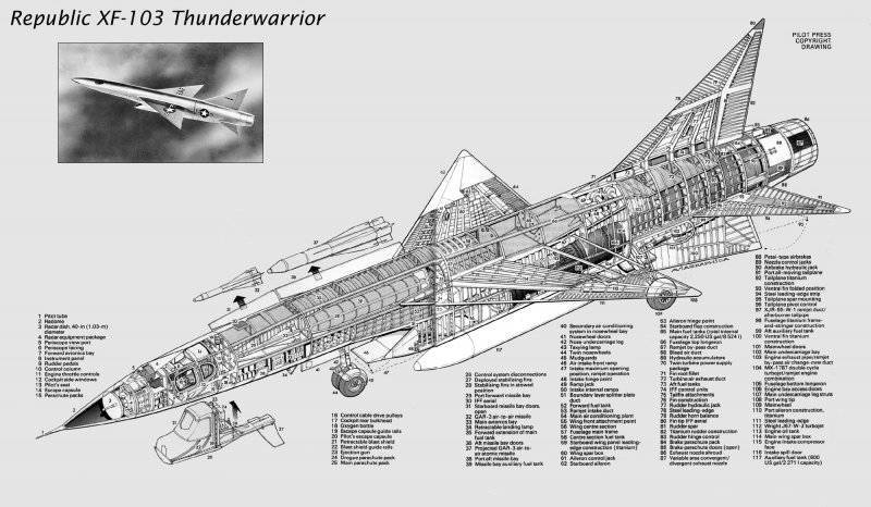 Возвращаясь к американскому проекту, можно отметить, что истребитель XF-103 должен был развивать скорость в 3 Маха на высоте 18 300 метров. При взлете в облегченном варианте (17 240 кг) практический потолок машины должен был превысить 21 300 метров. Максимальная взлетная масса истребителя составляла 19 500 кг, в том числе 1940 литров топлива, которое размещалось в двух подвесных топливных баках. Величина взлетной массы была определена, исходя из боевого радиуса действия в 600 км. XF-103 Thunderwarrior обладал треугольным крылом (стреловидность по передней кромке крыла составляла 55 градусов), стабилизатором и килем. Для увеличения маневренности машины на больших скоростях полета вместо элеронов использовали цельноповоротные законцовки крыла. Шасси самолета было полностью убираемым.