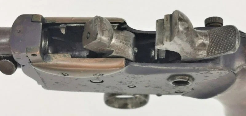 Стрелок нажимал на кольцо рычага, который начинал отодвигать курок, ставя его на боевой взвод. Чуть позже начинал отодвигаться и затвор, который приводил в действие экстрактор, выдвигавший стреляную гильзу, которая, наткнувшись на зубец подавателя пистолета, выбрасывалась из пистолета.