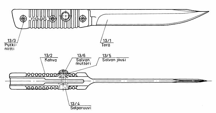 Клинок штык-ножа к штурмовой винтовке Valmet Rk. 62 однолезвийный, без долов. Рукоять пластмассовая с поперечными желобками, скреплённая с хвостовиком тремя заклёпками. В стальной спинке рукояти Т-образный паз, также в рукояти расположена пружинная защёлка с внутренним расположением пружины. Крестовина отсутствует.