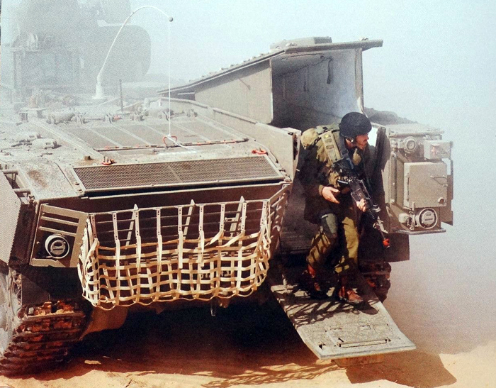 Как и в израильской «Меркаве» главный акцент был сделан на защиту экипажа и десанта. При этом машина должна была иметь весьма солидный уровень защиты. Перед силовым отсеком устанавливалась модульная броня габарит которой составлял 700-1000 мм (центральная деталь).