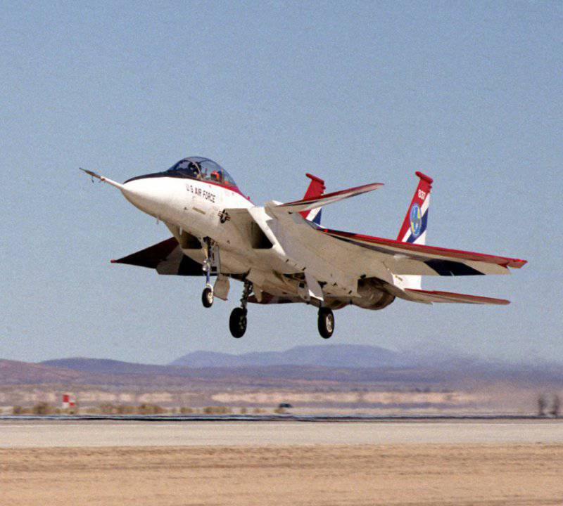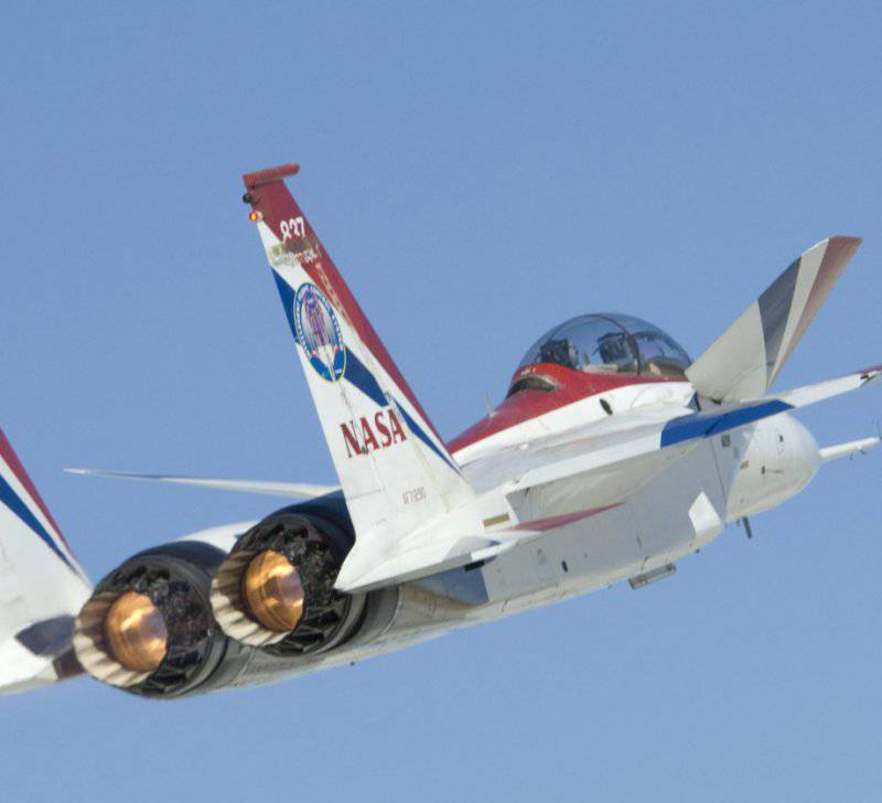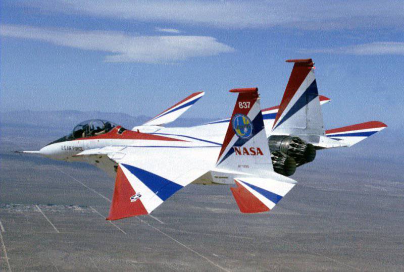 Летчик-испытатель НАСА Джим Смолка сразу после взлета с авиабазы Эдвардс на глубоко модернизированном экспериментальном самолете NF-15B включает форсаж на полную мощность и резко набирает высоту. К сожалению, на фото запечатлен крайний (последний) полет этой машины. Прототип был изготовлен в 1973 году как первый двухместный TF-15, Этот самолет с передними управляющими рулями и яркой красно-бело-синей раскраской летал в нескольких значимых исследовательских и тестовых программах ВВС США.