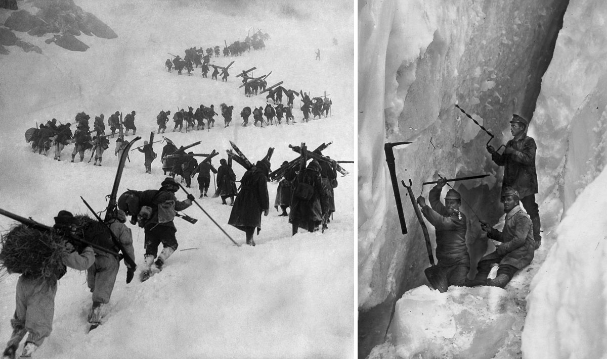 При этом Итало-австрийское противостояние 1915-18 годов шло на относительно небольшой территории, а линия фронта была гораздо короче, чем в России и Франции, всего около 300 километров. И из этих 300 километров более половины приходилась на труднодоступные высокогорные районы, где, по понятным причинам, интенсивные боевые действия с участием большого количества войск, были невозможны.