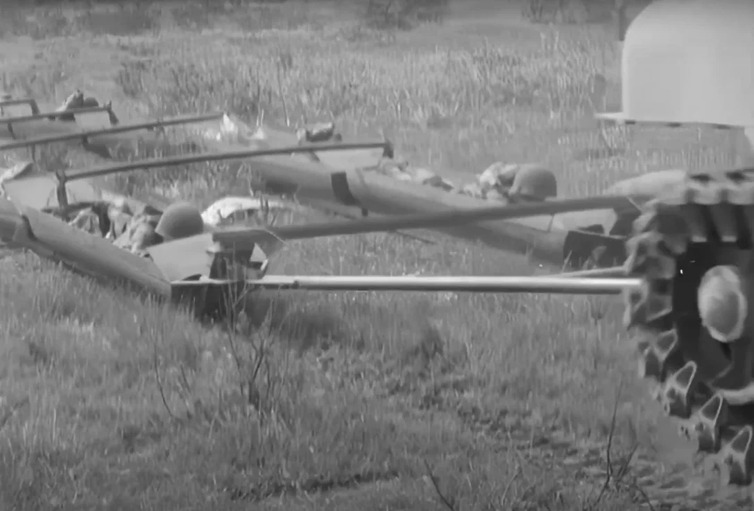 На архивных фото можно видеть, что все сани скреплялись между собой стальными трубами. Это нужно для соблюдения колейности, чтобы оба ряда саней следовали строго по колеям от гусениц. Смысл этого в том, чтобы все противопехотные мины сработали под гусеницами танка, а не под санями. Плюс ко всему в летнее время сани прикрывались густой растительностью, а зимой они закрывались высотой снежного покрова. Танк гусеницами утаптывал траву и снег, а сани скользили в этих глубоких следах.