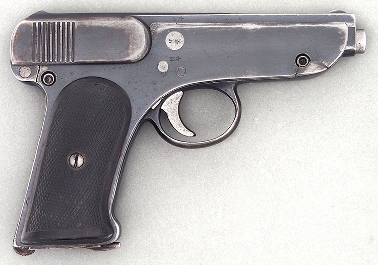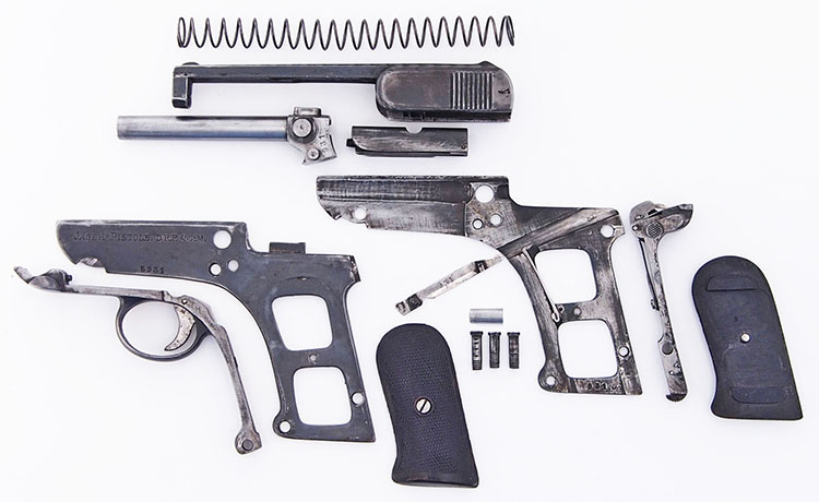 Этот пистолет не требовал сложных операций для производства рамки — она фактически собиралась из четырех частей, двух боковин из листового металла (толщина — от 2,7 до 2,5 мм), задника рукоятки, на котором одновременно собирался УСМ, и передней дуги со спусковым крючком и спусковой скобой. Ствол фиксировался в круглых отверстиях боковин рамки двумя цапфами. Затвор собирался из двух частей — несложного откованного на оправке кожуха и фрезерованной части с ударником и выбрасывателем.